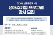 [ 중앙뉴스미디어 ] 인천시 남동구 구립도서관은 3~12월까지 운영하는 ‘2026년 상·하반기 생애주기별 프로그램’에 함께 할 프로그램 강사를 공개 모집한다고 12일 밝혔다. 올해 구립도서관 4개관(남동논현, 소래, 서창, 만수2동어린이도서관)의 생애주기별 프로그램은 10개 분야로 구성돼 운영될 예정이다. 강사 모집은 유아·아동 대상의 영어·한국사·생태·미술·전래놀이·경제 등 8개 강좌와 성인 대상의 책 놀이·영어독서 지도 교육 등 2개 강좌를 대상으로 한다. 관련 분야 전공자, 교육과정 이수자, 자격증 소지자, 강의 경력자라면 누구나 강사로 지원할 수 있다. 지원자는 강사지원서·강의계획서·자기소개서 등 서류를 준비해 1월 16일까지 남동논현도서관 또는 서창도서관에 방문하거나 이메일을 통해 제출하면 된다. 구는 매년 강사 공개 모집을 통해 여러 분야의 우수한 강사를 발굴·선발하여 생애주기별 프로그램을 진행하며, 지역주민의 교육적 삶의 질 향상과 독서문화 활성화를 통해 지역 내 독서문화 진흥을 도모할 수 있기를 기대하고 있다. 자세한 사항은 남동구립도서관 홈페이지 또는 남동논