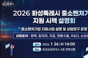 [ 중앙뉴스미디어 ] 화성특례시가 관내 중소기업과 소상공인의 경영 애로 해소와 지원사업 활용도를 높이기 위해 오는 26일 화성상공회의소 컨벤션홀에서 ‘2026년 화성특례시 중소벤처기업 지원 시책 설명회’를 개최한다. 이번 설명회는 화성특례시를 비롯해 경기지방중소벤처기업청, 중소벤처기업진흥공단 등 13개 유관기관이 추진하는 ‘2026년 기업지원 사업’에 대한 종합적인 정보를 제공하기 위해 마련됐다. 설명회는 오후 2시부터 4시 30분까지 진행된다. 사전 신청도 가능하며, 별도 사전 신청 없이 기업인 및 소상공인 누구나 당일 현장 방문으로도 참여할 수 있다. 지원사업 발표는 ▲정책 분야(화성시, 화성산업진흥원) ▲일자리 분야(경기도일자리재단) ▲자금 분야(중소벤처기업진흥공단, 기술보증기금, 신용보증기금, 경기신용보증재단) ▲판로·수출분야(경기지방중소벤처기업청, 경기도경제과학진흥원, 경기지역FTA통상진흥센터) ▲R&D 분야(경기지방중소벤처기업청, 경기테크노파크) ▲소상공인 분야(소상공인시장진흥공단) 순으로 진행된다. 또한, 전 참여기관이 설명회장 외부에 별도로 마련된 상담창구에서 1:1 상담을 진행해,